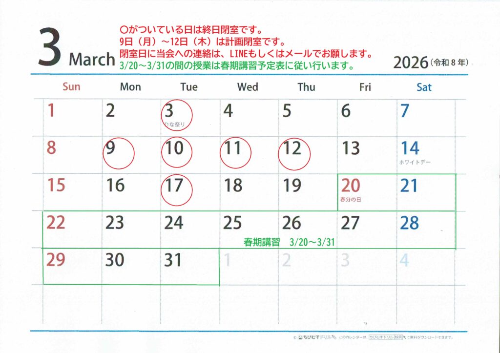 ☆3月19日までの通常授業ご案内☆