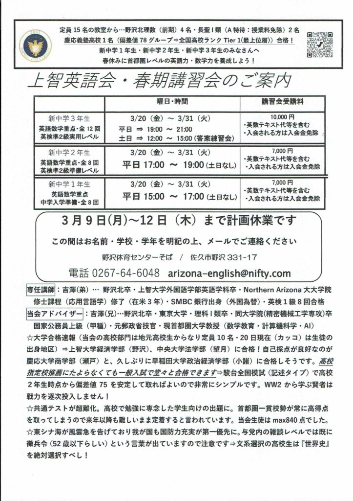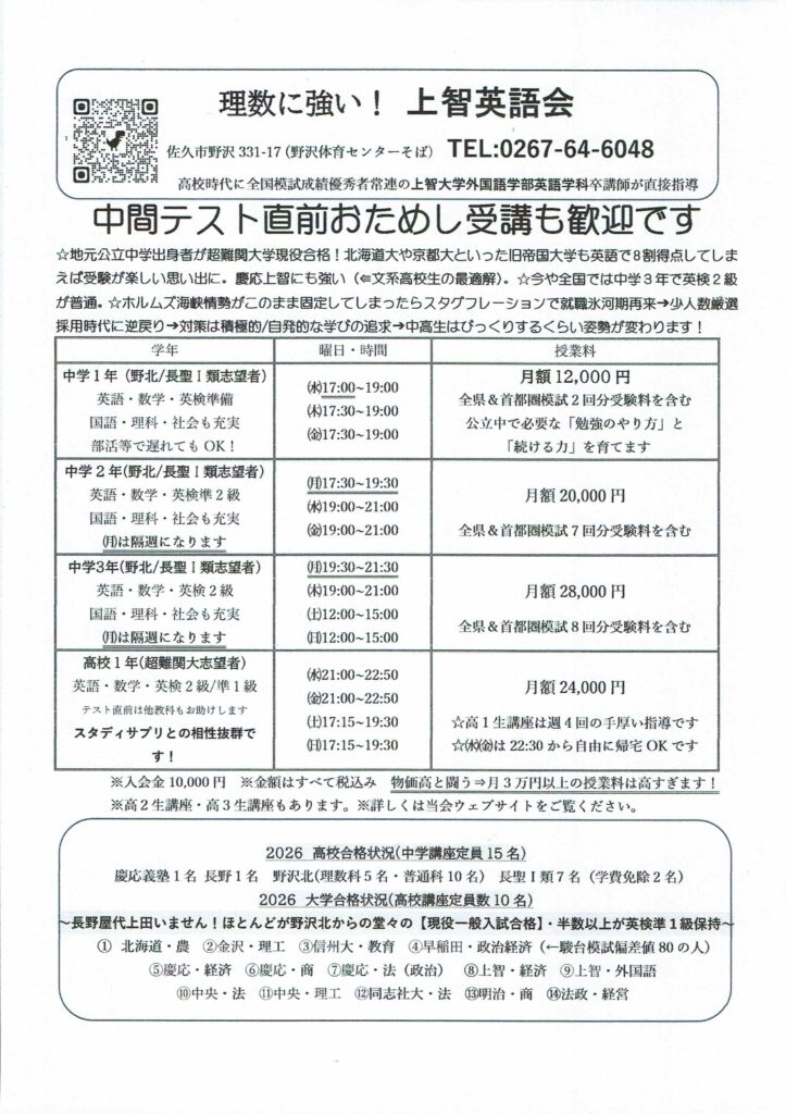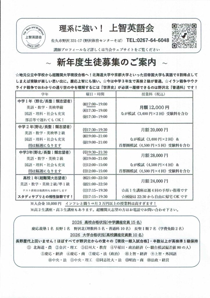 当会は「野沢北高校(理数科・普通科)や長聖Ⅰ類に入りたい中学生」「難関大学や医学部医学科へ行きたい高校生」のために開設された正式な法人企業格を持つ小さな学校です。当会の代表者自身の受験経験・社会経験に基づいて、一切の虚飾を排して「本音」で運営されています。そのため、当会は大きな看板を出しませんし、大きな道路や駅前などに教室を出しておりません。探してでも来ていただくようになっています。